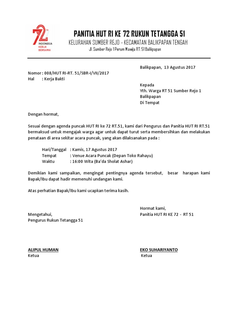 Surat undangan non resmi adalah surat undangan yang dibuat perseorangan atau kelompok untuk mengundang seseorang dalam kegiatan yang demikian undangan ini kami sampaikan, mengingat pentingnya acara bakti sosial ini maka diharapkan seluruh undangan dapat menghadari rapat. Surat ini cukup simpel namun tetap harus memperhatikan nah bagi anda yang ingin membuat surat tersebut, maka di bawah ini saya buatkan beberapa contoh surat undangan kerja bakti rt yang diharapkan. Karena dengan kerja bakti dia bisa membantu 1 tempat, tapi dengan mengepalai & mengkoordinasikan petugas yg tepat dia bisa membantu ini berlaku buat semua pemimpin daerah atau presiden sekalipun. Buat temen2 yang mau tanya, mau share tentang program magang bakti bca silahkan. 0 ratings0% found this document useful (0 votes).
